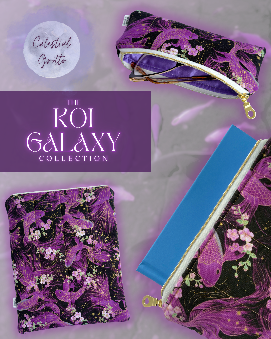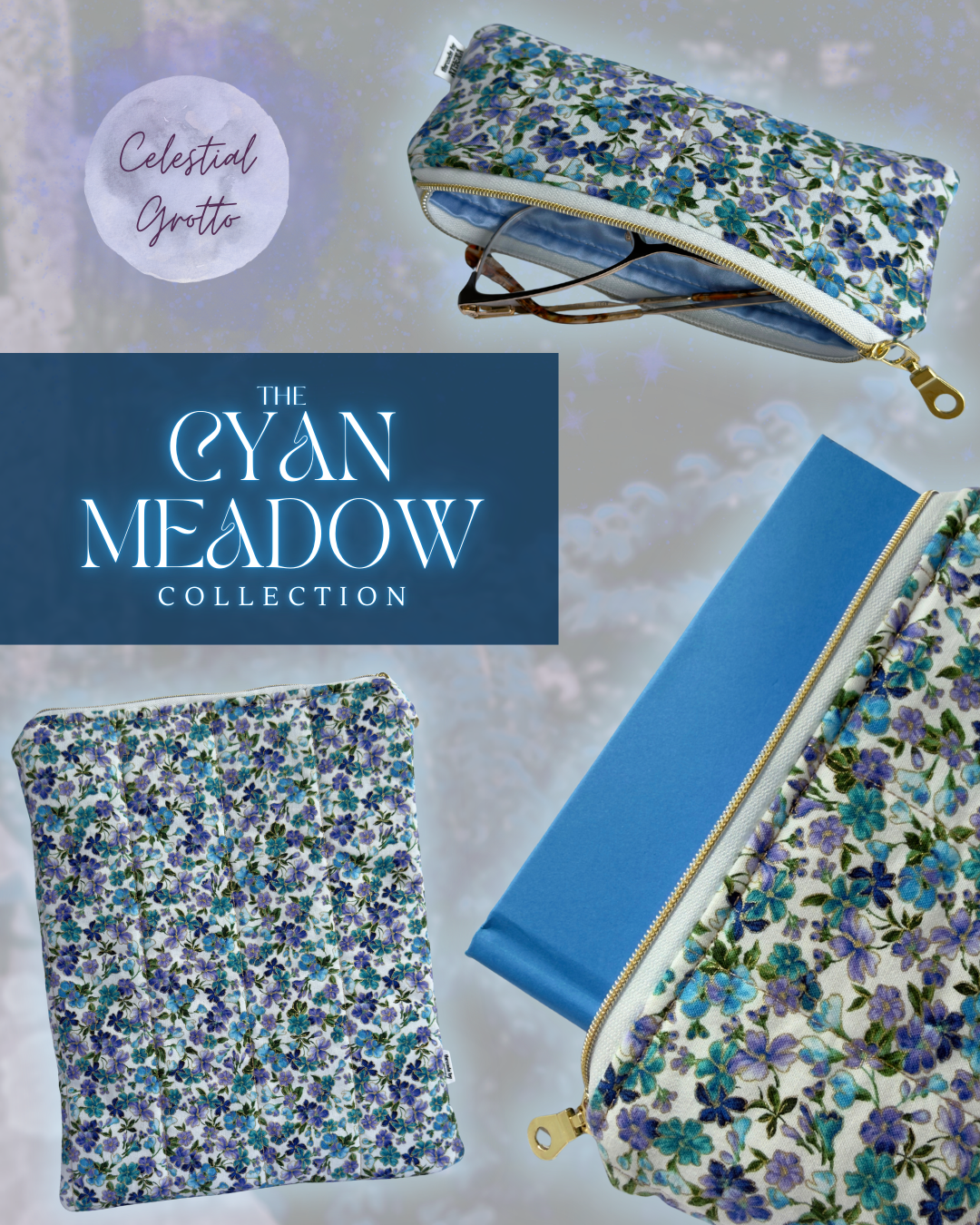 a sci-fantasy inspired collection of handmade book sleeves, e-reader sleeves, and stationery pouches - featuring ethereal fabrics with metallic gold embellishments.